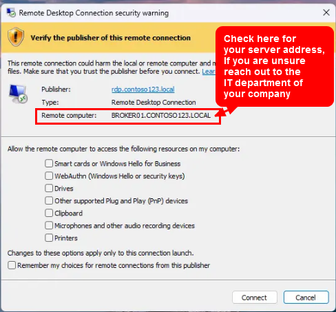 Due to this, when opening RDP the popup in the screen below will appear. You can safely connect if the Address in the Dialog box is a server you are familiar with. The reason this is changing is due to hackers now sending compromised .RDP files via email phishing which allows hackers to access systems. Remember, never open any file attachment in an email that contains an .RDP file! In general, no one should be sending RDP files to you, if you do receive one contact your IT department immediately as it can be fraudulent; used to connect to a remote computer for the hacker.